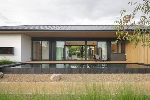 The hall is enveloped by lush gardens and a large swimming pool, seamlessly connected by curved solid walls. These walls control the atmosphere,